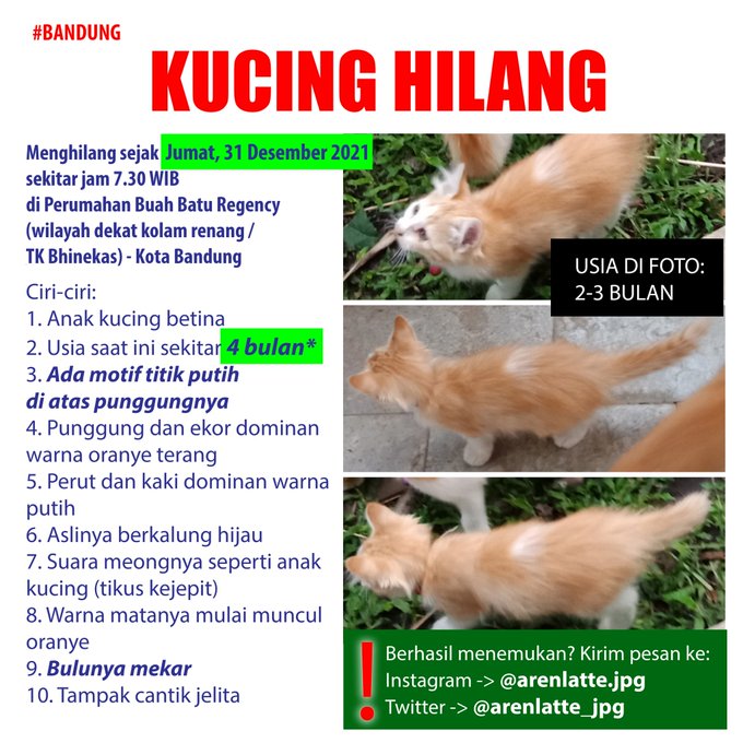 Hilang Anak Kucing Sesuai Pic Arenlatte Jpg Telah Hilang 1 Anak Kucing Betina Warna Oren Terang Sejak Jumat 31 Desember 2021 Sekitar Jam 7 30 Wib Lokasi Hilang Di Perumahan Buah Batu Regency Kota